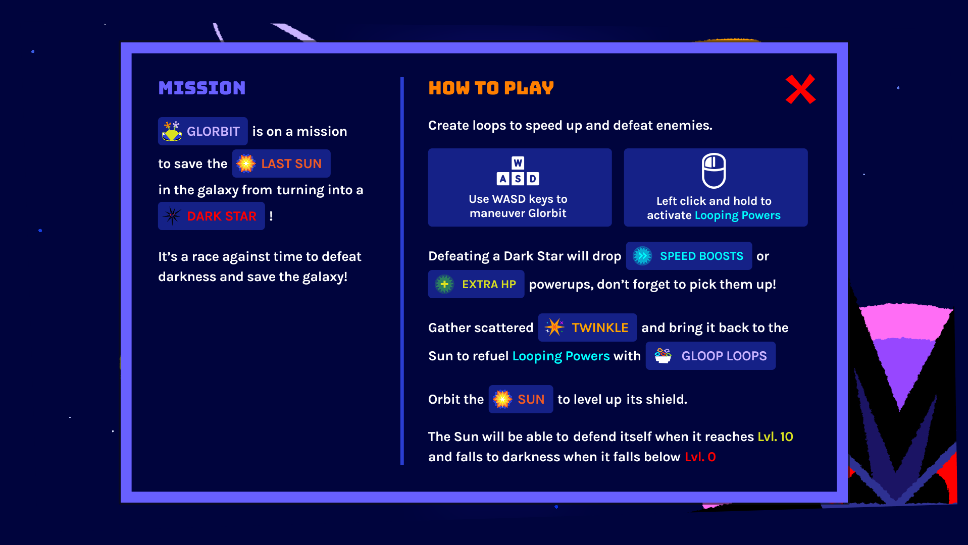 GLORBIT is on a mission to save the last sun in the galaxy from turning into a corrupted Dark Star. It's a race against time to defeat darkness and save the galaxy. Pick up power ups and orbit your way to victory in this glorbous arcade game!